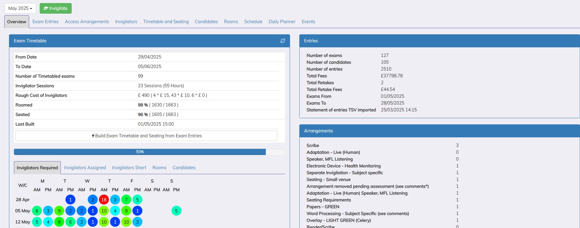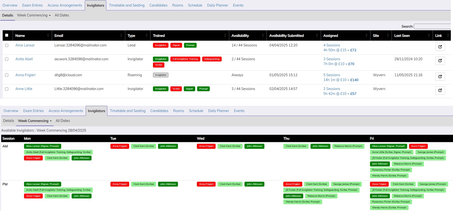 This provides the details of the rooms that an invigilators/staff has been scheduled in. It is also possible to edit the allocated invigilators.