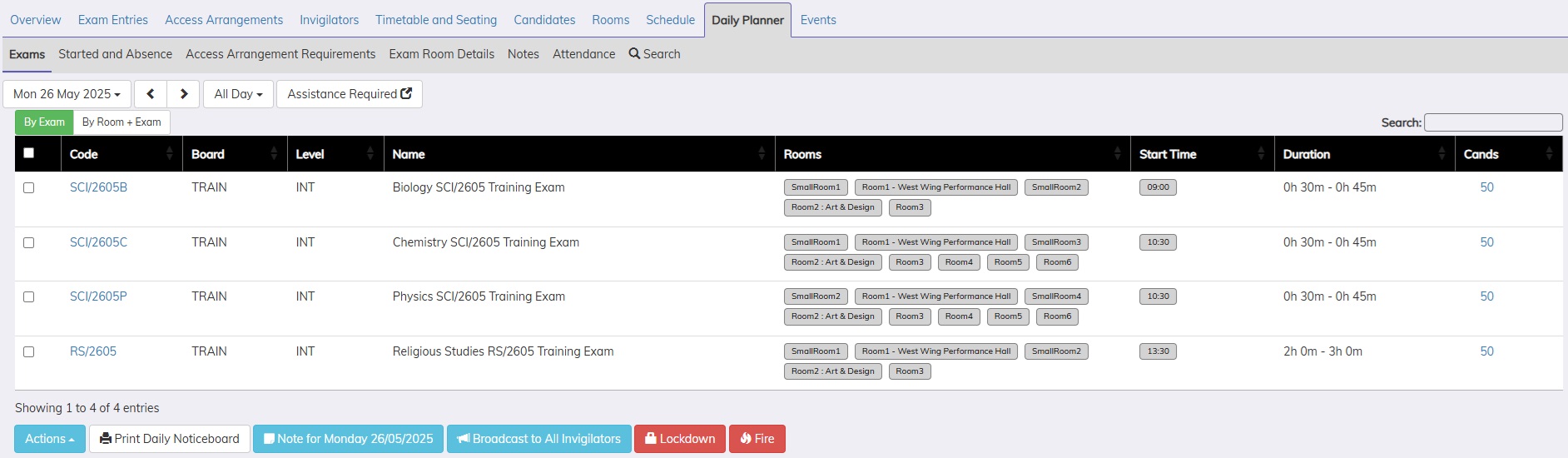 The Daily Exam Planner tab is an essential tool for any EO on a day of an exam. All information that an EO or SLT would require is available in this section from the list of the examinations running that day to writing the examination attendance back into SIMS.net (This tab does display exams information for any season). This section is further broken into sub-tabs: