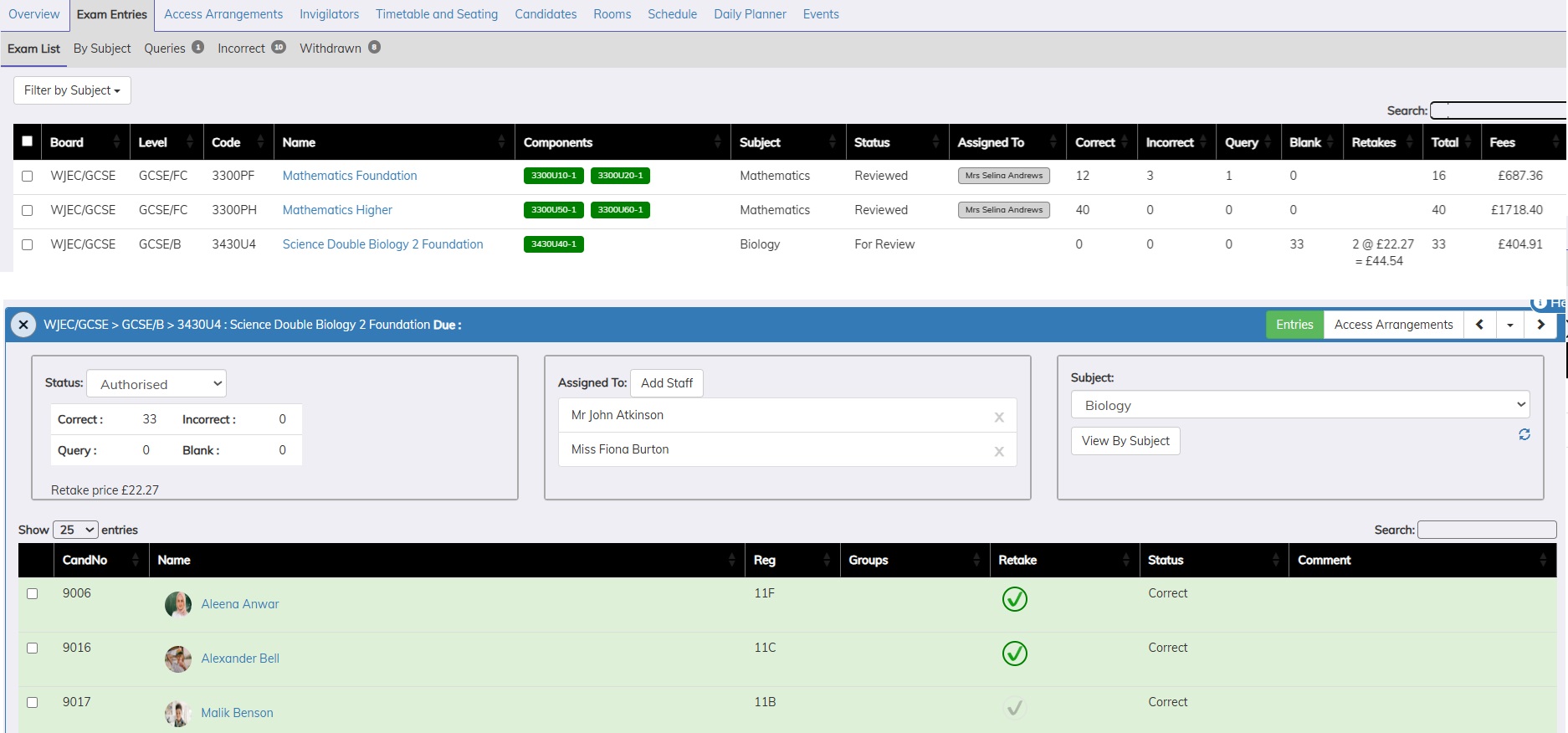 Allocate the 'Examination Entry List' to an individual or a group of staff for them to check and confirm that the entries are correct. These entries are visible to staff via the exams assist portal and can be either viewed as a list of elements or as a group of elements per subject. As well as environmental benefits this process