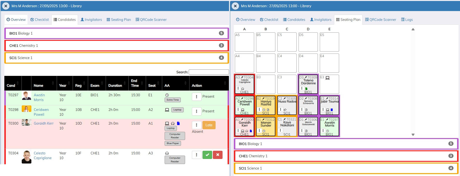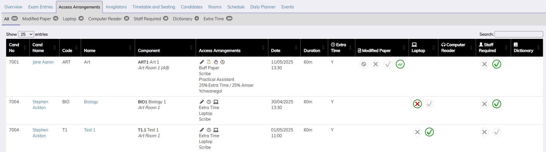 View the candidates 'Access Arrangements' requirements in one location, these are also displayed graphically by using icons. Using icons helps invigilator to see easily what the candidates require i.e. coloured papers, reader, scribe, prompter etc. These icons follow through the whole system and appears on the candidate cards, attendance registers and seating plans created by this system.